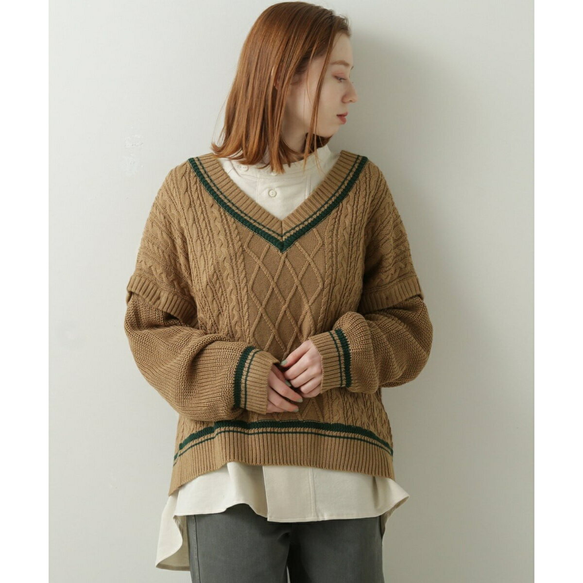 【 送料無料 】【earth music&ecology】SET2点スラブケーブルベスト+カットチュニック チュニック ベージュ プラス ライン ニット EARTH Ema セット earth music & ecology 模様 シルエット リボン アクセント 長め 着丈 ヒップ 優しい カバー ラウンド フォルム ポイント