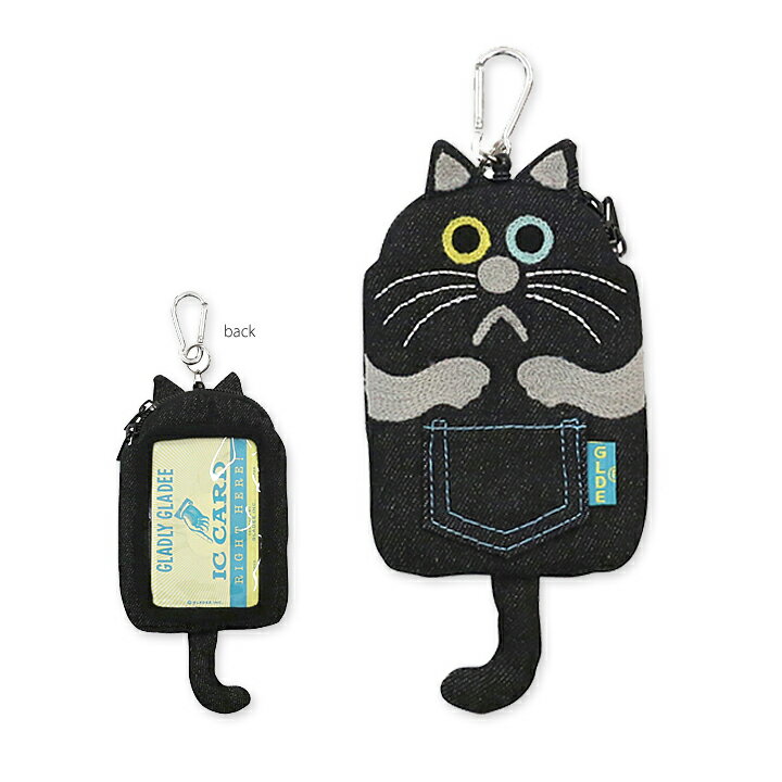【メール便対応】デニムICパスカードケース黒猫(ICカードホルダー/パスケース)GLADEE(グラディー)・SUICA(スイカ)やPASMO(パスモ)を入れるカードケース定期入れリールキー付き、ファスナー付きポーチにも